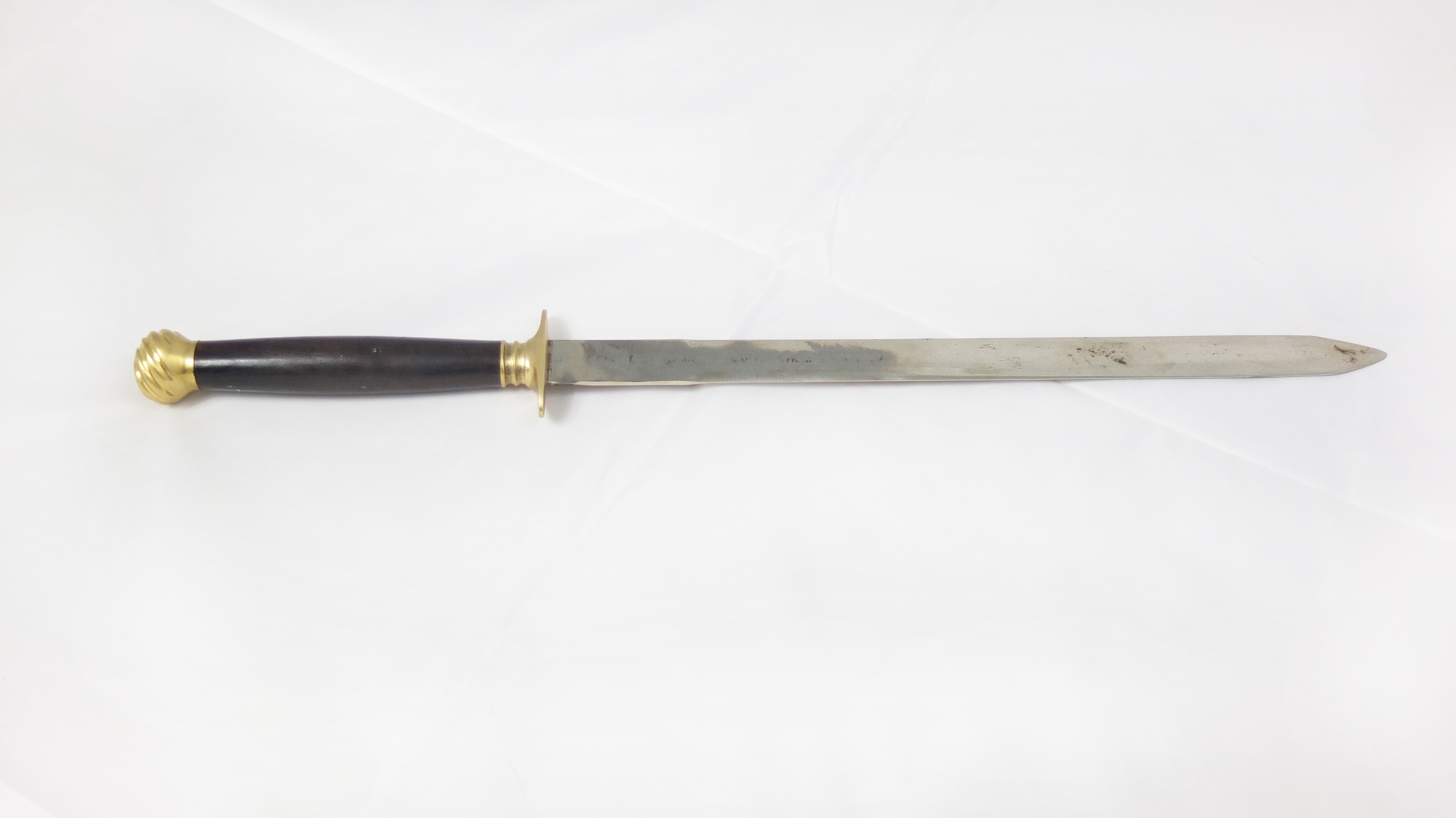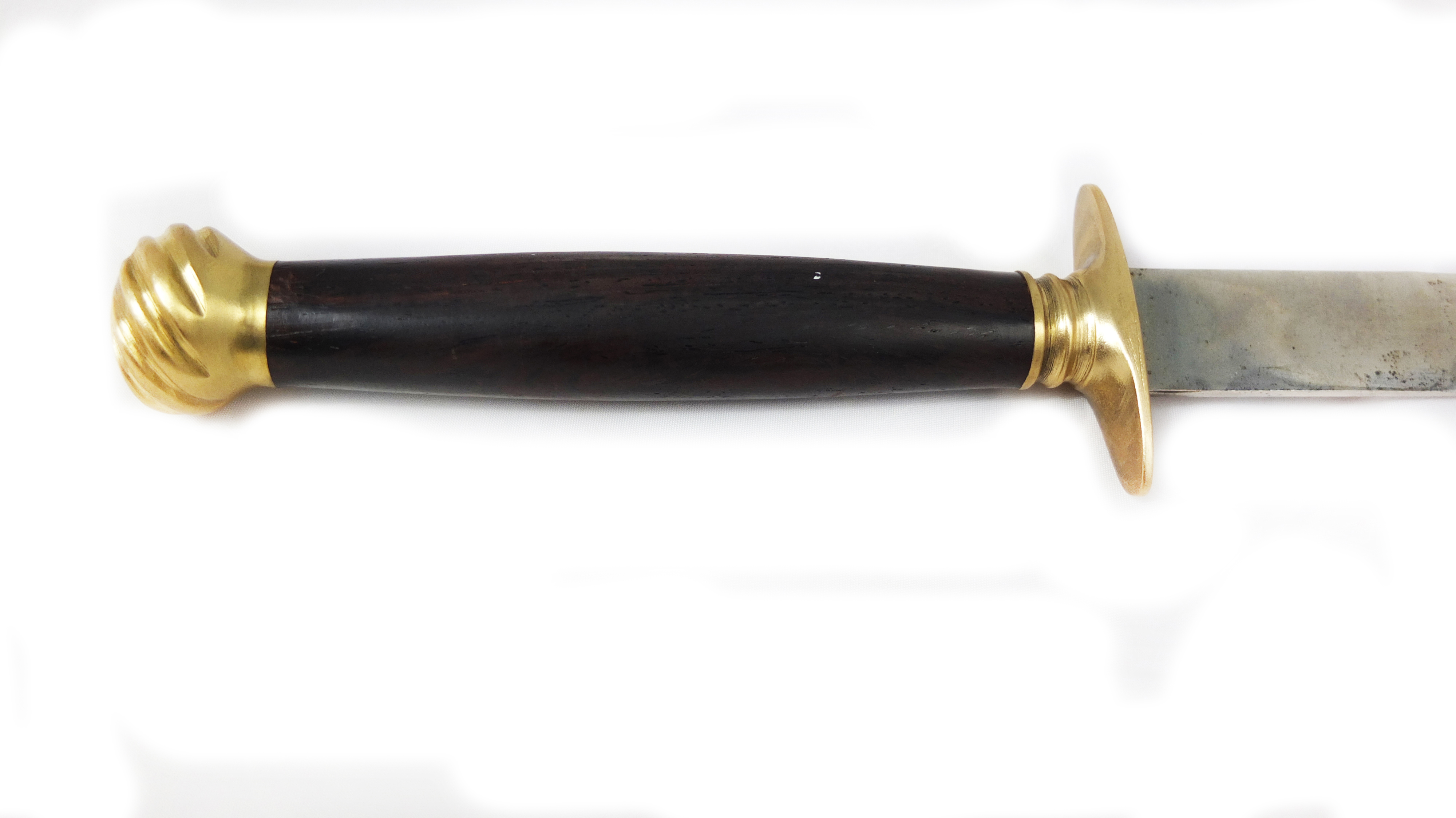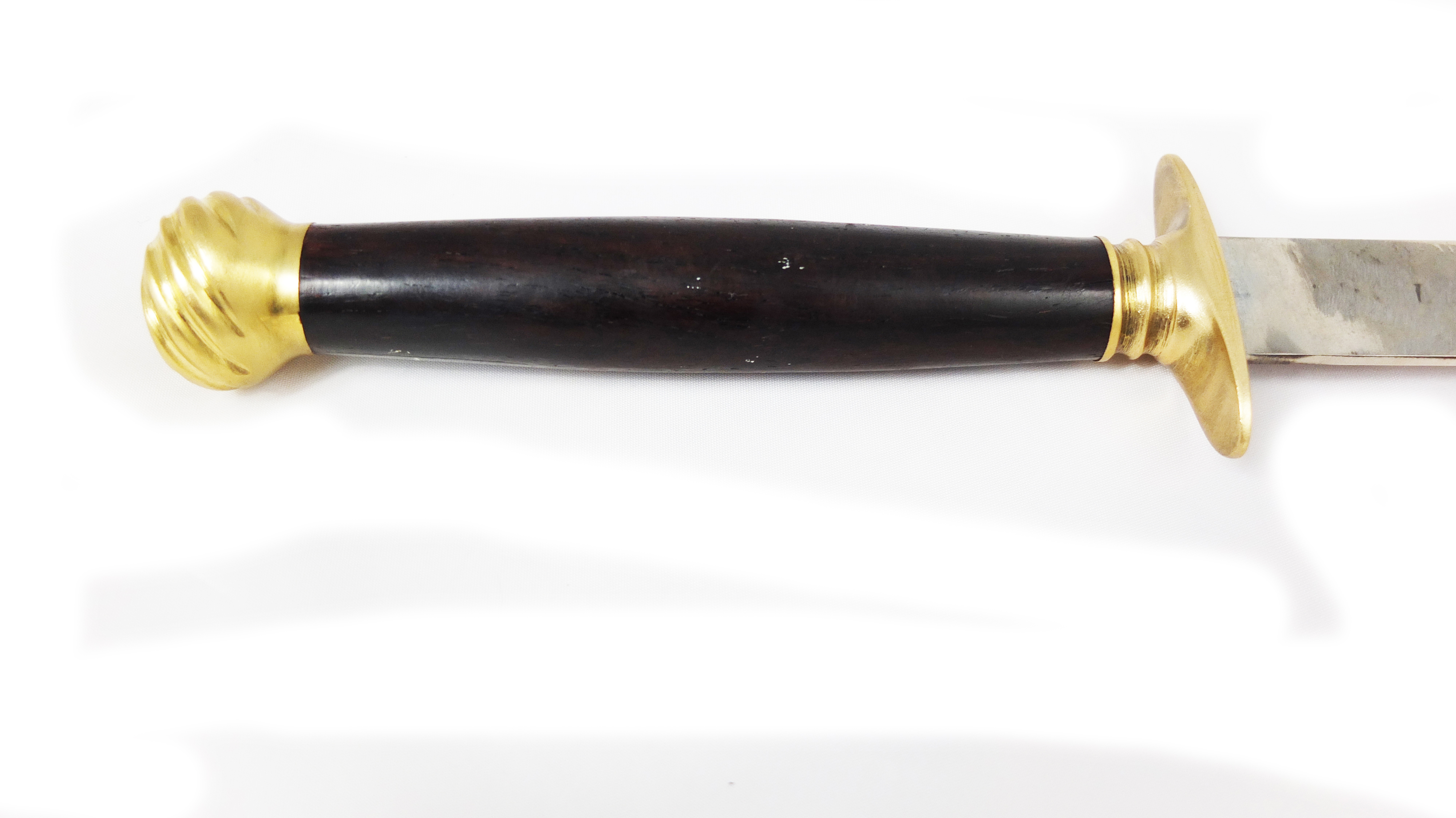 - Daga Corta antigua y discreta, con hoja solida de doble filo de sección triangular, con un puño redondeado en madera, guarnición y pomel de bronce, con medidas de 49 cm. de longitud de pomel a punta, y 2 cm de ancho de hoja.